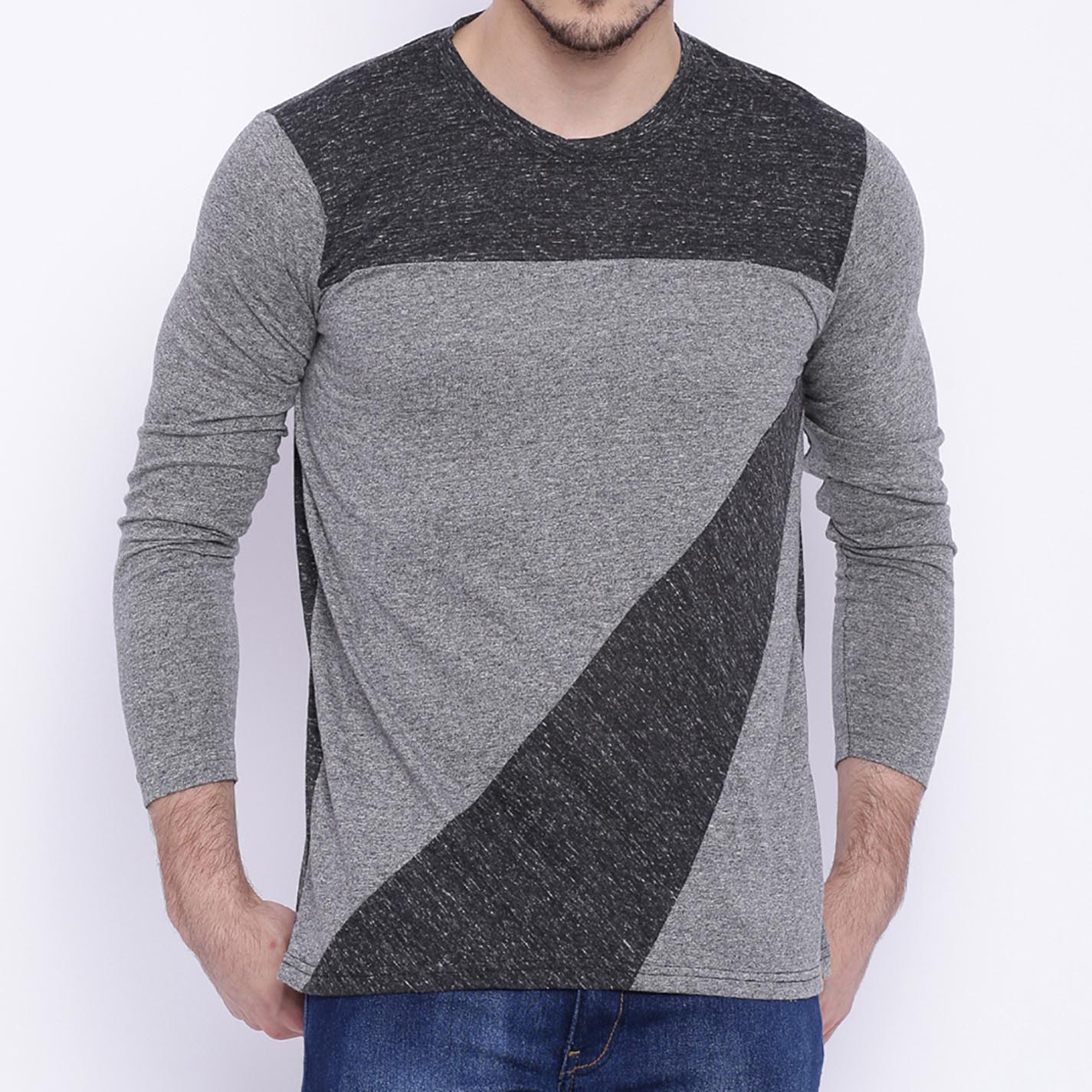 Grey colour blocked waist length T-shirt, has a round neck, long sleeves